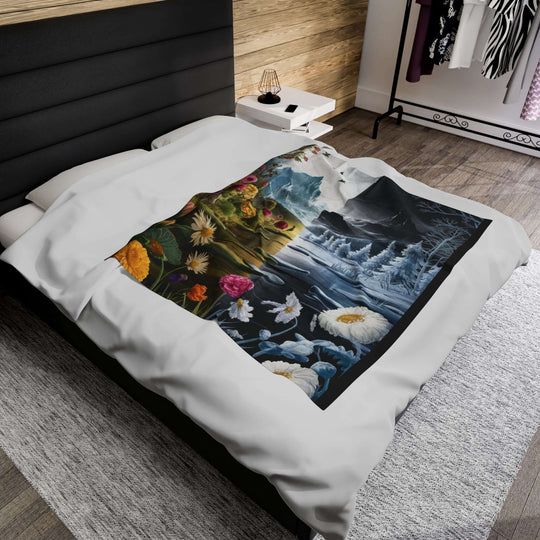Bring the beauty of contrasting seasons to your home with this compelling velveteen plush throw blanket.