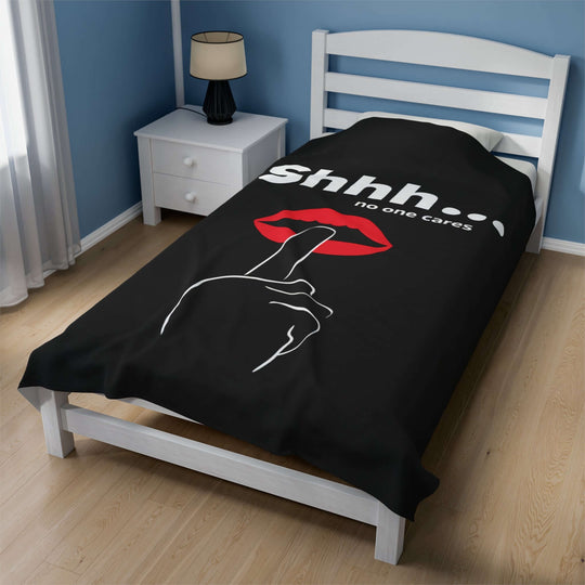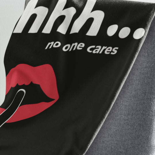 This Blanket features a humorous and tongue-in-cheek design with 'Shhh no one cares' printed in a playful manner.