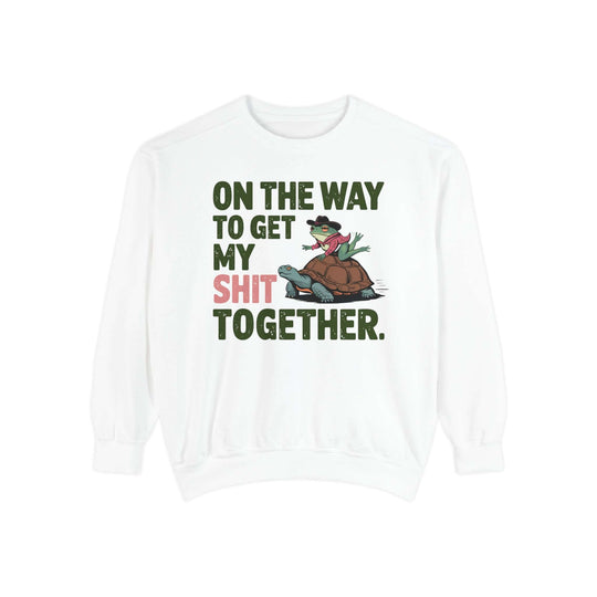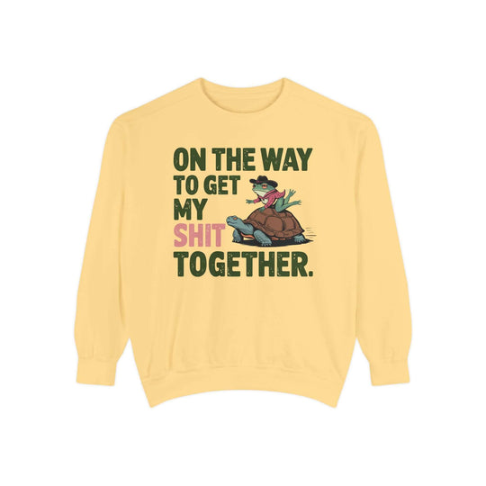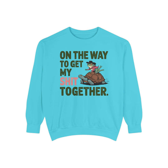 This humorous sweatshirt is screen printed with a laughing frog-on-a-turtle face graphic featuring the text "On the Way to Get My Shit Together". Whimsical, but readily identifiable graphic makes the tee perfect for anyone who can relate to a humorous comment. It is a great shirt to lounge around the house or hang out. Fun for a quirky and contemporary you.