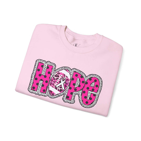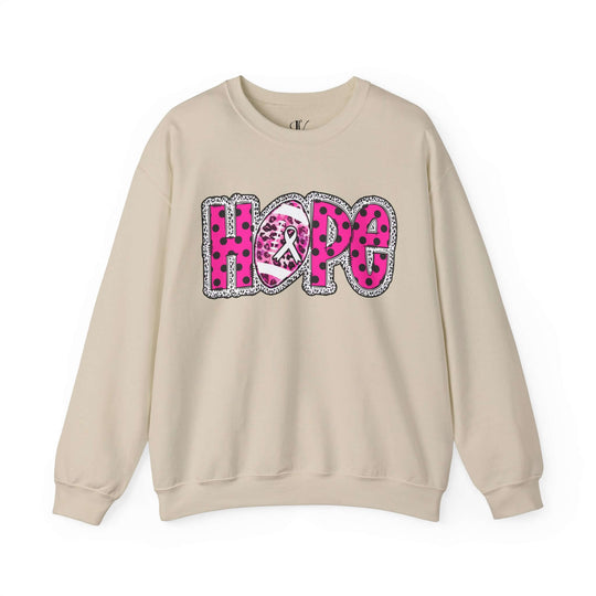 This Breast Cancer Awareness sweatshirt features a graphic print of the word "HOPE" in large, pink leopard print letters, surrounded by a pink breast cancer awareness ribbon. This uplifting design conveys a message of hope and hopefulness for a person with breast cancer. Perfect for adults who want to show support during Breast Cancer Awareness Month.