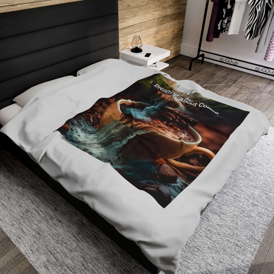 This cozy blanket features a highly surreal design with a large coffee mug overflowing with a river and a waterfall cascading from a mountain landscape. The use of the words 'Dreaming About Coffee' creates a touch of humor and familiarity, and the inclusion of the river, mountains, and leaves brings the design back into nature. Perfect for anyone who loves to snuggle up with a warm blanket and a hot cup of coffee, this blanket is ideal for nature lovers and coffee lovers. It's also a great gift idea on holidays, birthdays, or special occasions.