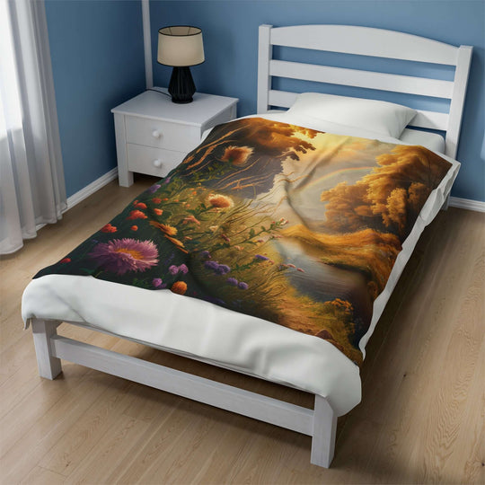 With visible brushstrokes and a peaceful natural landscape with a flowing river, lush foliage, and a vibrant rainbow, this blanket embodies the beauty of Impressionist art. The muted color scheme creates a peaceful and relaxing atmosphere filled with romance and wistfulness. Perfect for art lovers and anyone who loves to snuggle up with a touch of artistic flair. The ideal birthday, holiday, or special occasion gift in which beauty and comfort are on the docket.