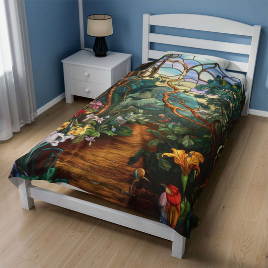 This throw blanket is a velveteen with the design of a stained glass work, featuring colored, detailed craftsmanship to create the illusion of a garden scene.