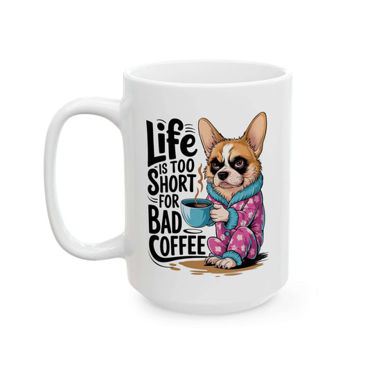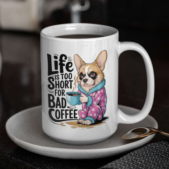 Whimsical and functional ceramic coffee cup with a humoristic and cheerful design featuring a cartoon dog and clever words. Perfect to spice up and personalize your morning or afternoon coffee or tea. Perfect for animal lovers and those seeking a dash of humor in everyday life. Perfect birthday, holiday, or other special occasion present.