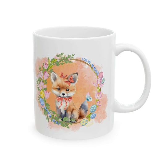 This lovely picture on this ceramic mug depicts a bow-clad fox with a floral wreath of Easter eggs and butterflies all around, creating a spring-like and whimsical impression. Perfect for design enthusiasts of Easter themes, this mug is perfect to use on a daily basis or as a springtime gift.