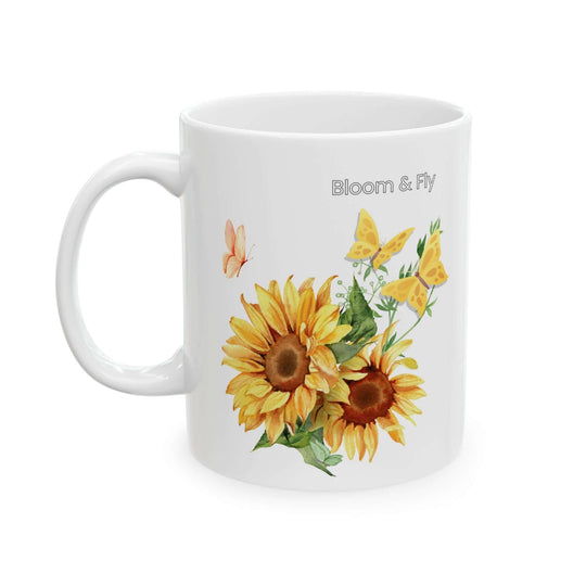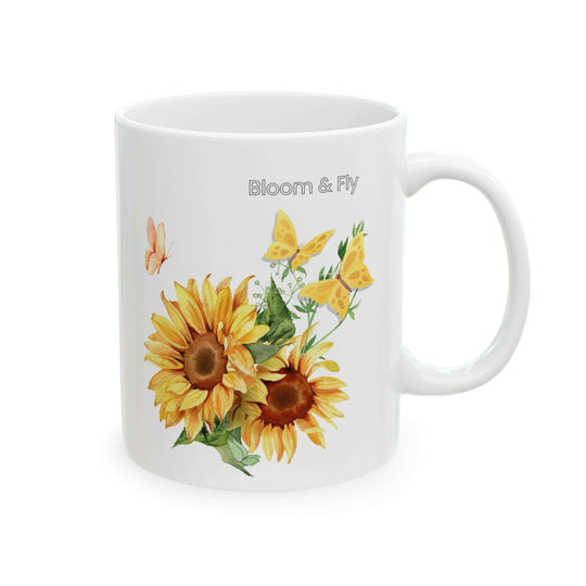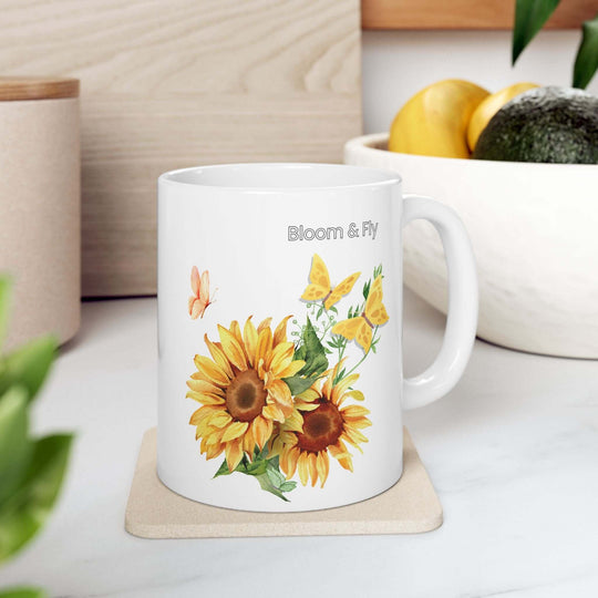 A bright and motivational ceramic mug with print of sunflower, butterflies, and inspirational quotes. Best for nature lovers and flower print people. Best for spring and summer seasons, the mug is a good gift to nature lover and positive mindset friends and relatives. Best for birthday, Mother's Day, or simply to spread some positivity into one's life.