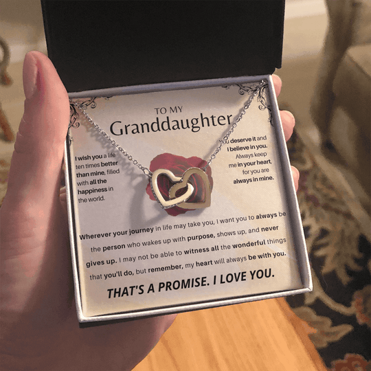 • Artisan-crafted interlocked hearts necklace: stands for the unconditional love of a grandparent for a granddaughter. Designed with two hearts, one in silver and one in rose gold, and surrounded with AAA+ cz crystals.