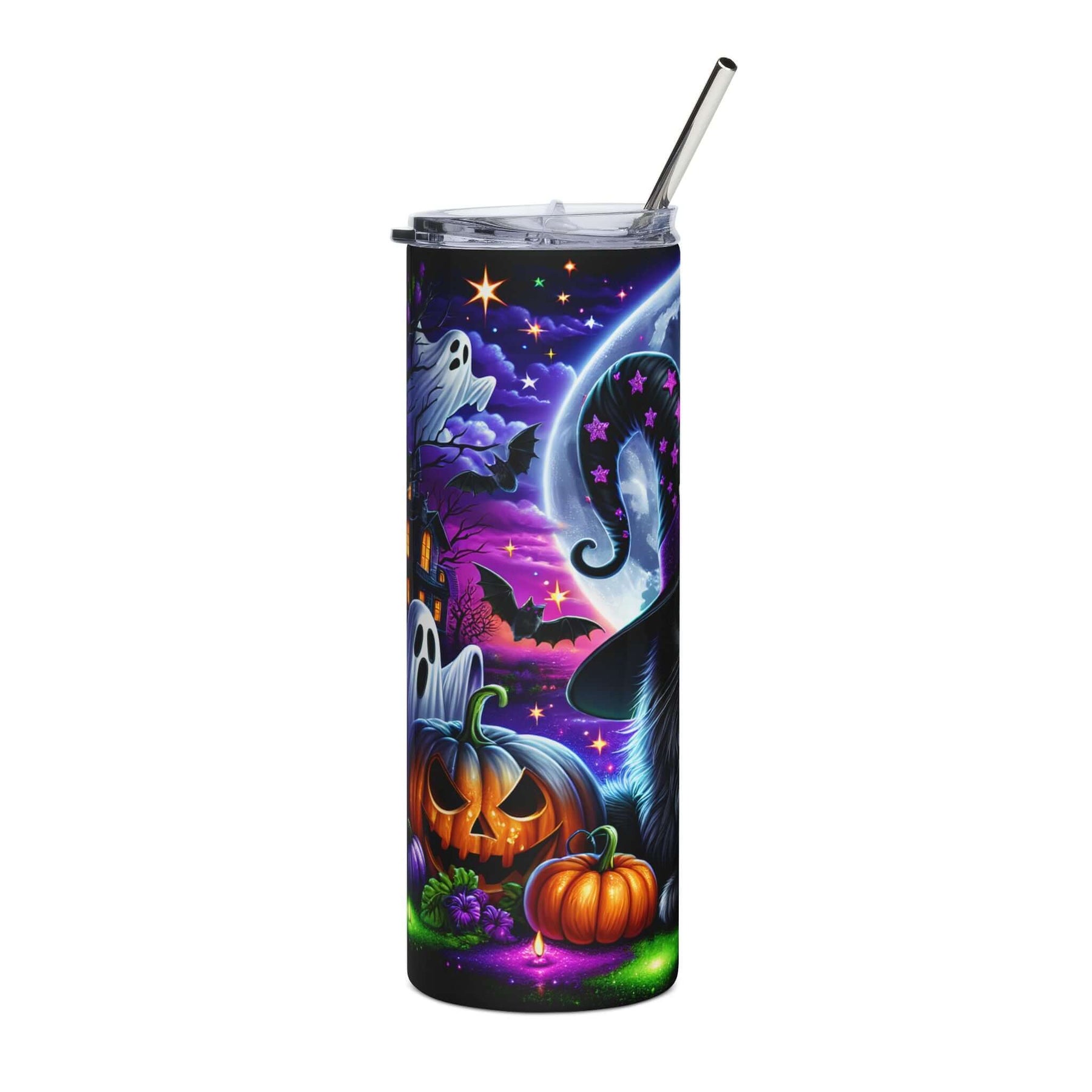 Halloween Tumbler — 20oz Stainless Steel with Black Cats, Ghosts & Haunted House