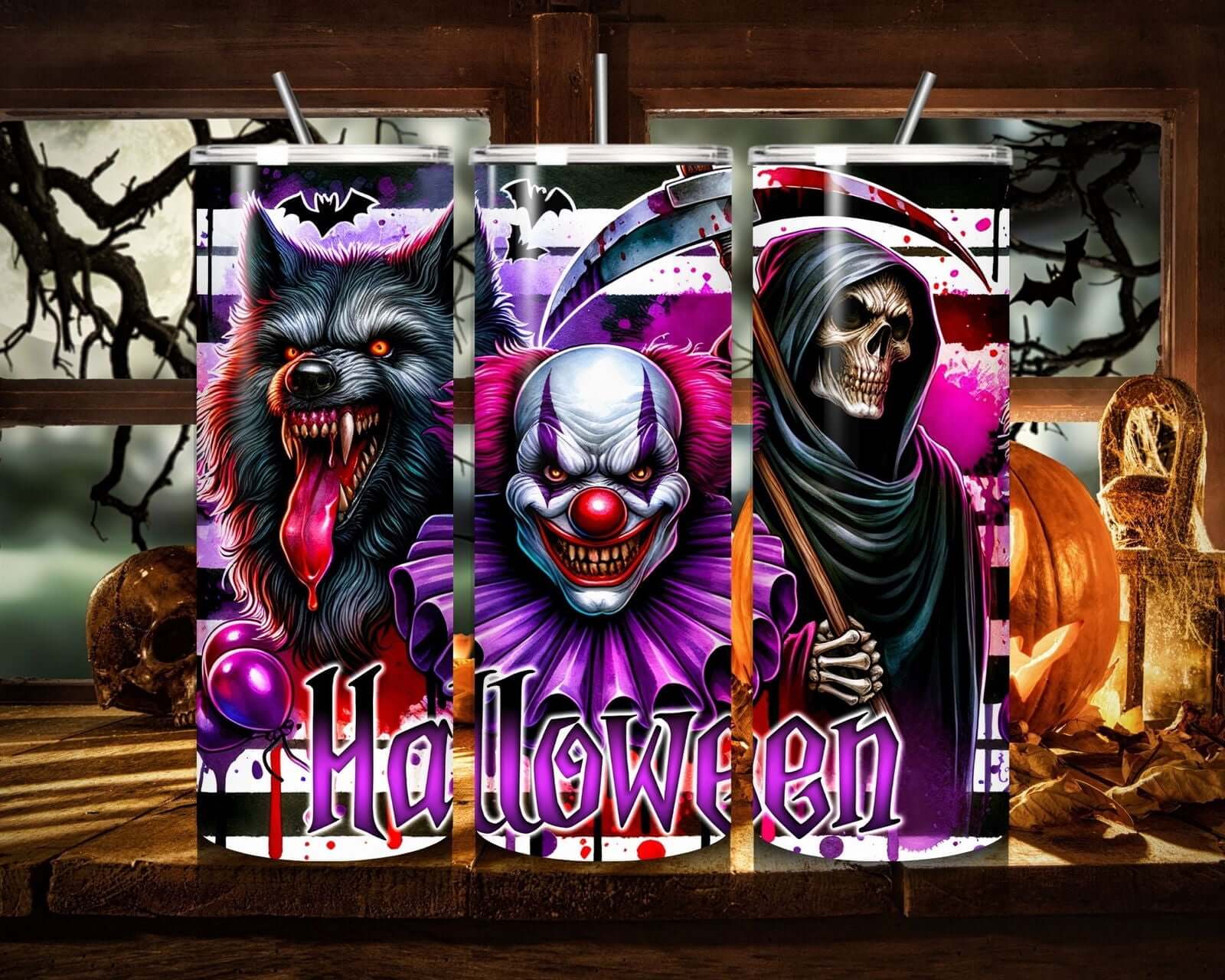 This 20 oz stainless steel tumbler brings Halloween to every sip. Dark illustrations of werewolves, sinister clowns, and the Grim Reaper wrap the full 360° surface, turning a simple drinkware piece into a roaming scare-scene. It feels substantial in the hand, with a glossy protective finish that keeps the artwork vivid while standing up to daily use. The included lid and straw make it easy to grab coffee on the go or settle in for an evening of horror movies. For collectors of spooky aesthetics or anyone who loves a touch of macabre in their routine, this tumbler adds atmosphere to late-night drives, haunted-house trips, and cozy autumn nights with the lights low.