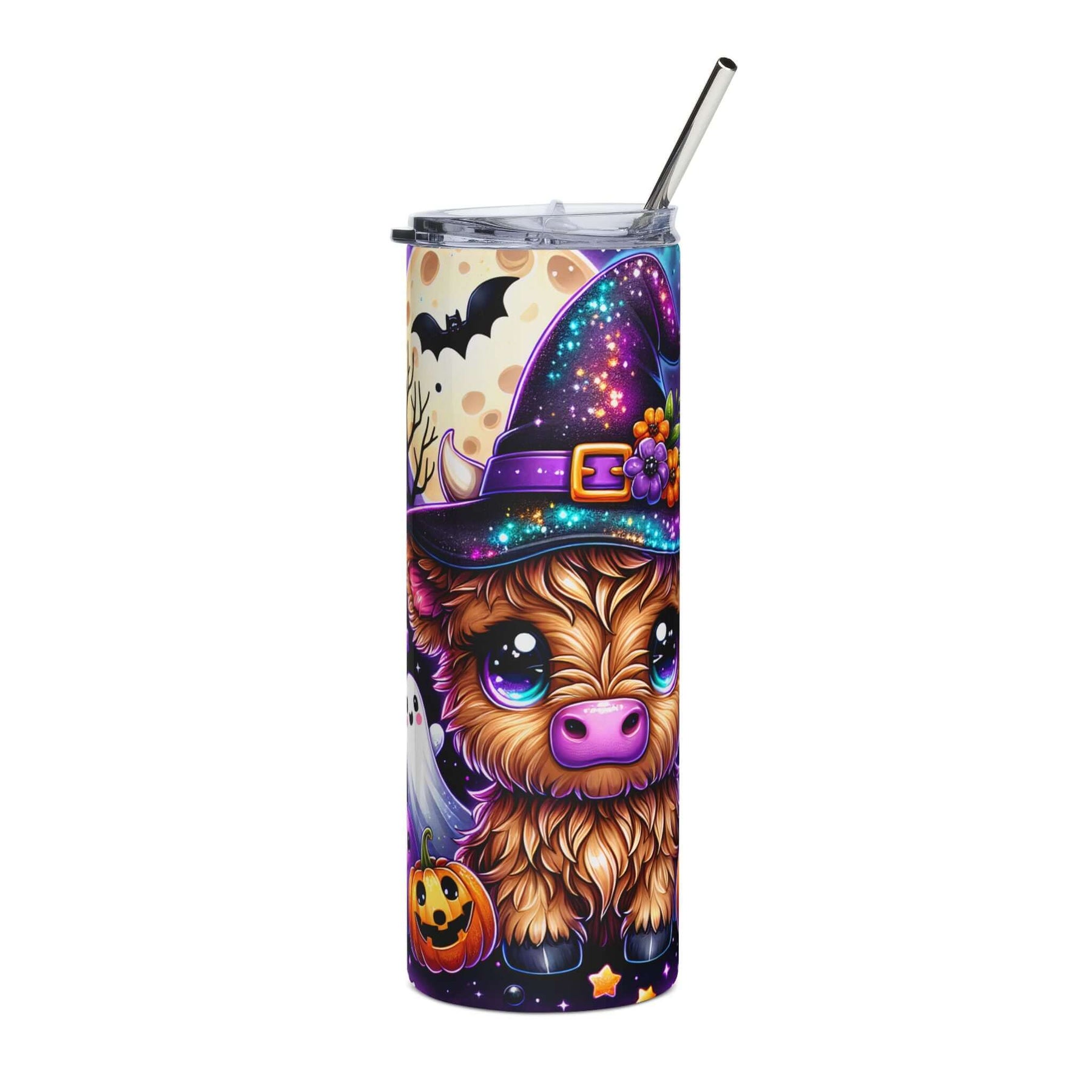 This 20 oz stainless steel tumbler carries a cozy, slightly spooky vibe — a wide-eyed calf in a crooked witch hat stands beneath a glowing moon, surrounded by friendly ghosts, pumpkins, and fluttering bats. It feels like a brisk evening on a lantern-lit lane: warm hands wrapped around a durable tumbler, breath fogging in the air, and the quiet thrill of autumn night sightings. For folks who collect seasonal charm or enjoy playful Halloween motifs, this tumbler slips easily into daily routines — morning coffee on the porch, driving to a fall festival, or curled up with a pumpkin-spiced drink while leaves fall. The artwork is sweet rather than scary, marrying country whimsy with classic Halloween imagery so the piece blends into both casual everyday use and festive seasonal moments.