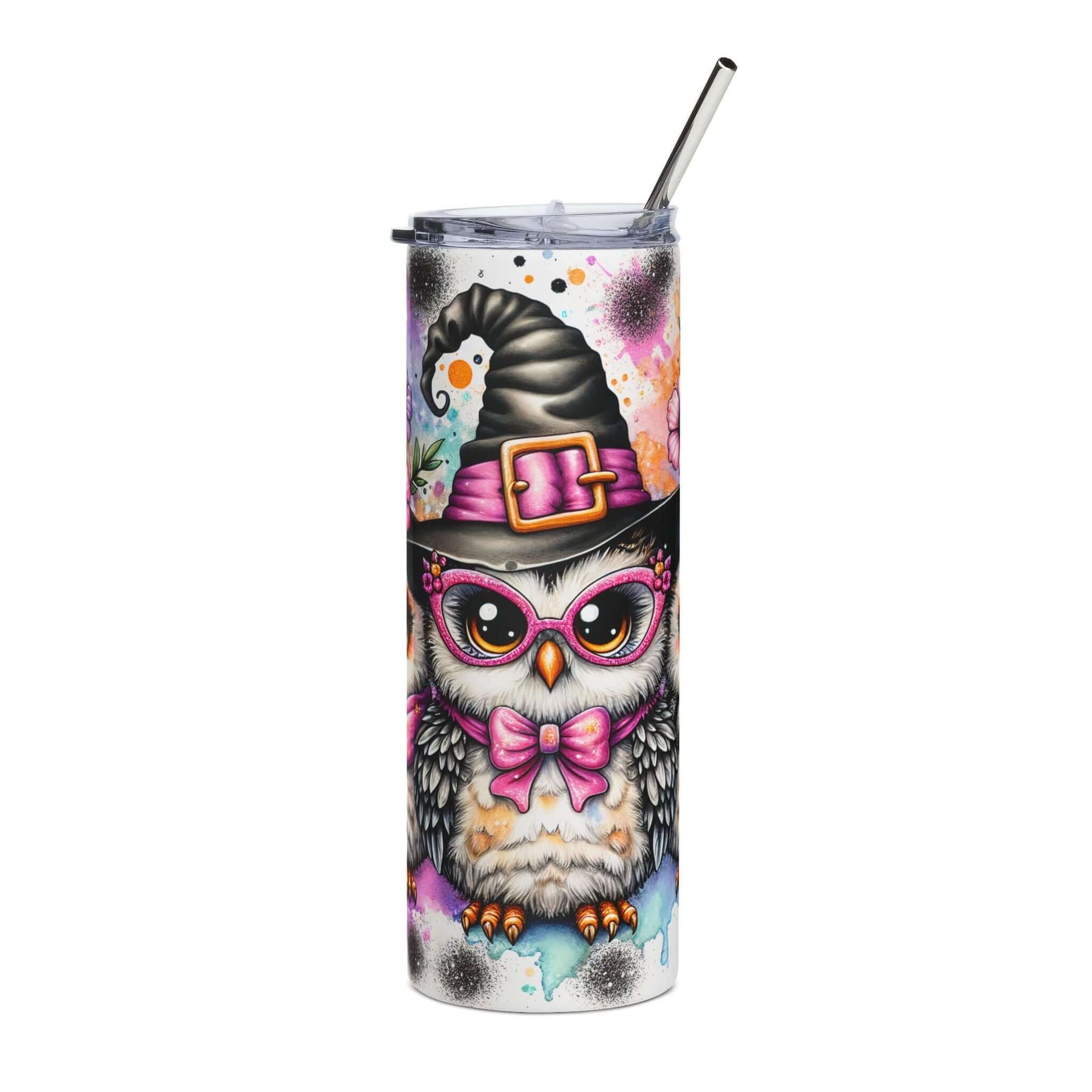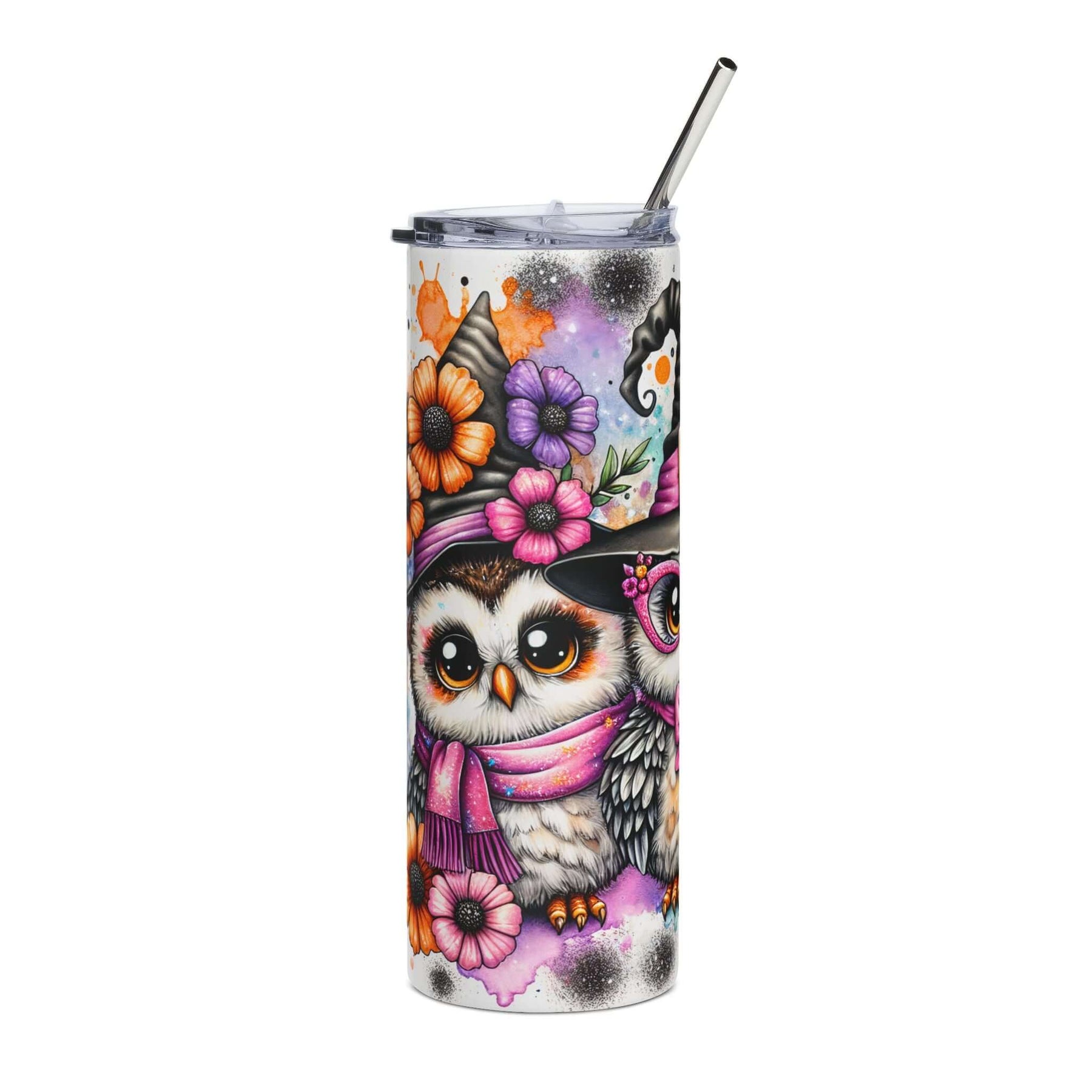 This 20 oz stainless steel tumbler brings a little spooky charm to everyday sips. Tiny owls in witch hats perch among carved pumpkins in front of a shadowy haunted house, giving the tumbler a playful, autumn-night vibe. It keeps drinks at the right temperature while the glossy, protective finish preserves the illustrated wraparound scene. The included lid and straw make it easy to use on the go — whether you’re strolling to a fall market, settling in with a warm drink at a moonlit porch, or packing a cold refreshment for a Halloween gathering. The compact cylindrical shape fits most cup holders and the full 360° printable area means the design wraps seamlessly, so the scene reads from every angle.