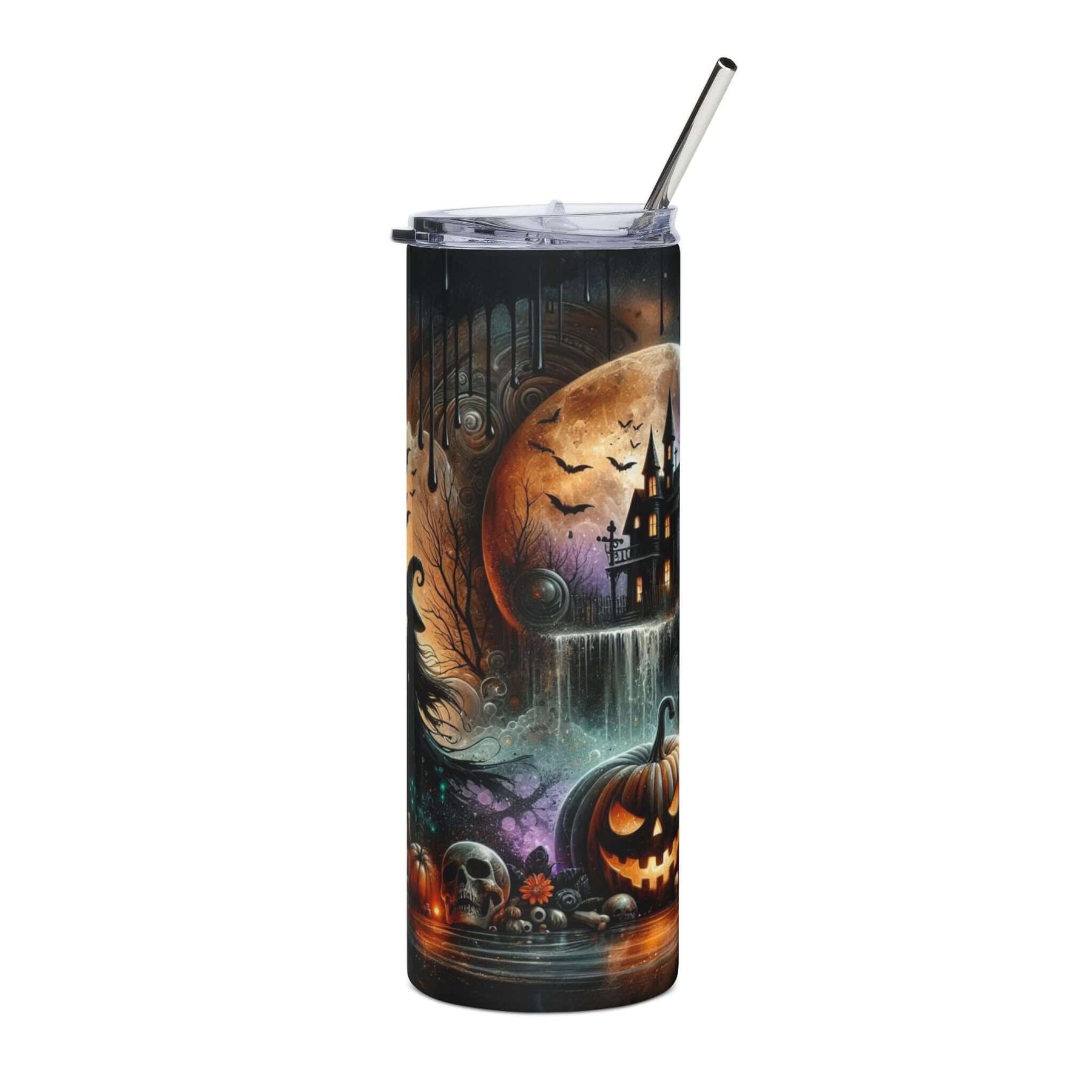 Sip something spooky with this 20 oz stainless steel tumbler dressed in gothic Halloween imagery. Witch silhouettes glide beneath eerie moons while haunted houses, skulls, and carved pumpkins wrap around the full 360° print area. It feels like a little midnight ritual in your hands — cool to the touch, solid in weight, and lively with dark, surreal details that pull you into a moonlit scene. Bring it to autumn night walks, Halloween crafting sessions, or to your desk as a quiet nod to the season; it sits comfortably in a cup holder and keeps your drink contained while the design does the storytelling.