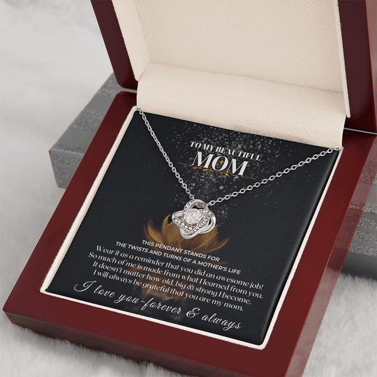 - This pendant stands for the twists and turns of a mother's life. Wear it as as reminder that you did an awesome job! So much of me is made from what I learned from you. It doesn't matter how old, big and strong I become, I will always be grateful that you are my mom. I love you - forever & always"