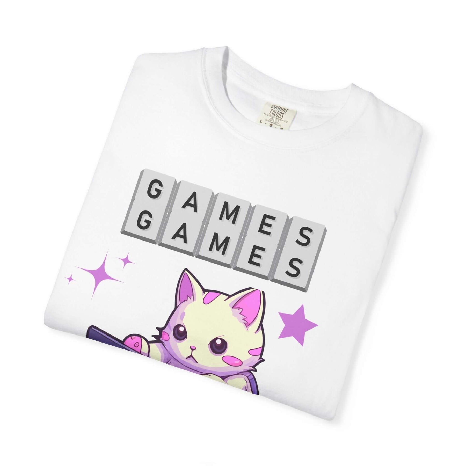 This kawaii style cat playing games T-Shirt features a cute design with the quote 'GAMES GAMES GAMES' as keyboard button style. Perfect for cat lovers and gamers, this fun and playful tee is great for casual wear or lounging at home. Ideal for birthdays, gaming parties, or just to show off your love for cats and games.