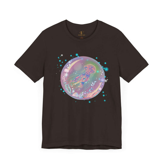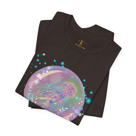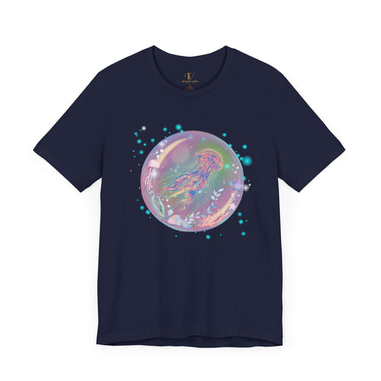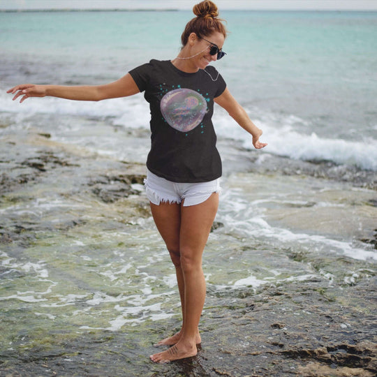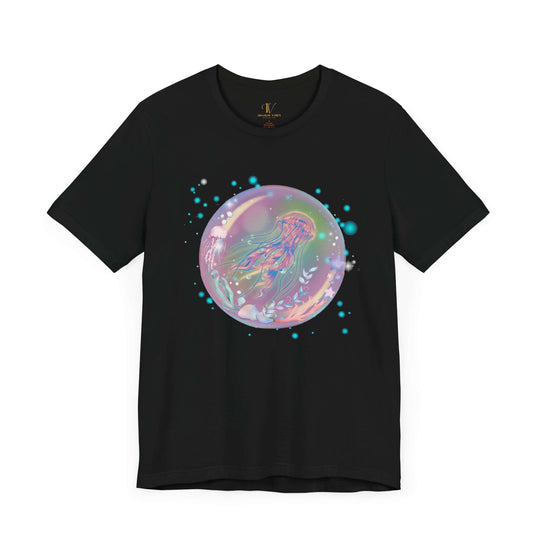 Dreamy and ethereal, this tee shows a jellyfish in a bubble-like orb that's filled with stars and heavenly objects. Simple in design, the scenery is emphasized using a black background, giving an artistic and crisp touch. Suitable for people who love ethereal and heavenly stuff, this tee is great for casual wear and layering. Perfect for star, jellyfish, and dreamy fans.