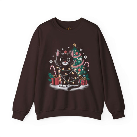 Add warmth and charm to your winter wardrobe with this adorable sweatshirt, featuring a cute cat tangled in Christmas lights! The playful and festive design makes it a perfect choice for cat lovers and holiday enthusiasts alike. Whether you're cozying up by the fire, attending a Christmas party, or gifting to a fellow feline fan, this sweatshirt is a holiday must-have!