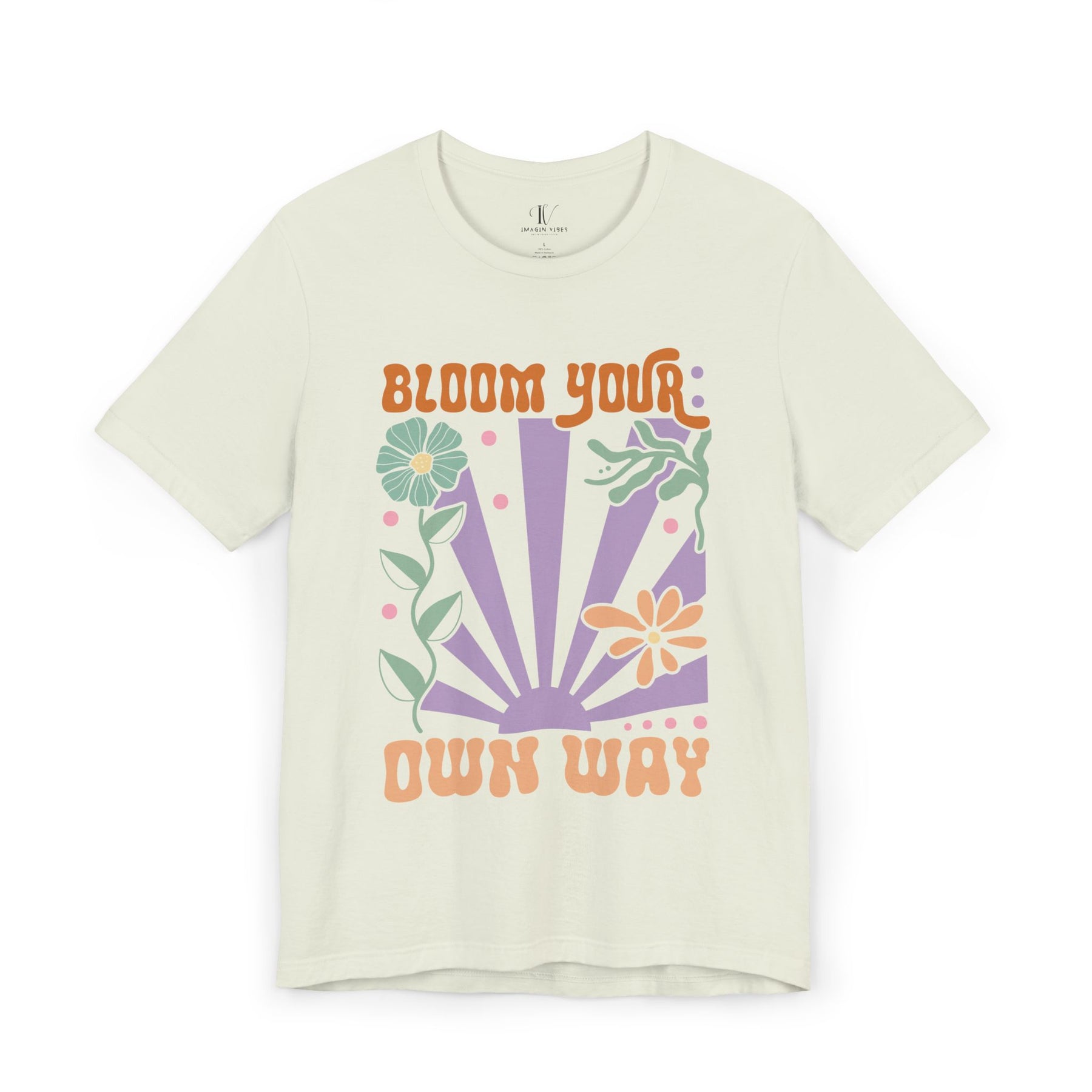 This t-shirt features a retro-themed, multicolored graphic in front that says 'BLOOM YOUR OWN WAY'. The graphic is vintage in style with stylized flowers, funky text, and bold colors. Perfect for those who believe in individuality and self-expression, this will be a good fit for casual and semi-formal attire. Perfect for holidays, parties, or events that promote individualism and creativity.